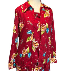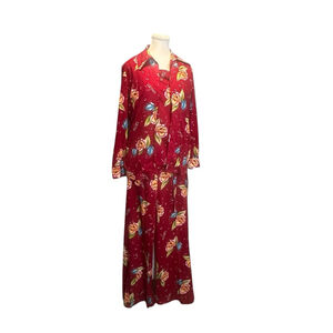 True vintage 1970s three-piece matching set featuring a bold botanical floral & insect print on a rich red background. Includes bell bottom pants, matching open jacket, and coordinating top — an iconic head-to-toe vintage look.