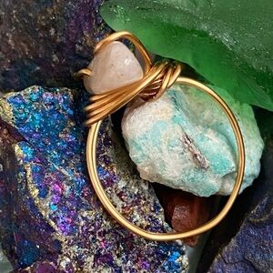 Very unique and larger milky Quartz stone, intricately wrapped for one of a kind ring. Milky quartz is also known as 'snow quartz' or simply 'white quartz'' It is associated with innocence and tranquillity. Milky quartz is said to help us view the world without preconceived ideas or prejudices. It is also believed to stop us being overwhelmed by strong emotions.