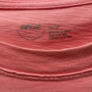 Included in this listing is an oversized, distressed, lightweight stretch knit top or tee from Aerie. It features a crew neckline, short sleeves, and a relaxed fit all on a soft, stretch pink fabric of 100% cotton. Distressed with raw seams. Size Small but runs large.