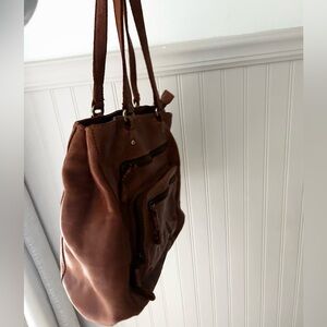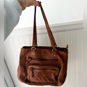 Leather tote • cognac shoulder bag • zipper pockets • work bag • travel bag • everyday tote • brown leather bag • preowned designer • roomy tote • functional leather bag