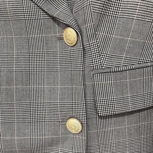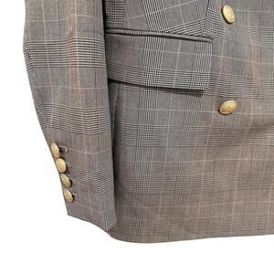 Item: Womens double-breasted blazer in a taupe glen plaid with gold-tone crest buttons; tailored and fully lined.