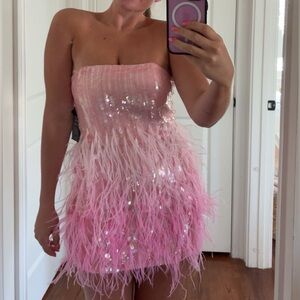 Let loose in our Anastasia Dress — a playful mini that will make any moment memorable. The shimmering dress features fuchsia sequins and airy feather embellishments throughout. The strapless silhouette is designed with supportive boning through the bodice to contour the curves of the body and is finished with an invisible zip closure. Shown here in Fuchsia.