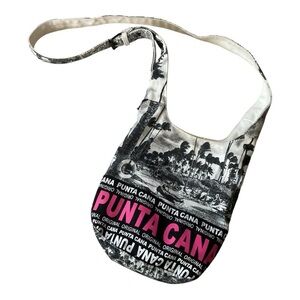 Carry a piece of the tropics with this Punta Cana souvenir crossbody bag. Features black-and-white tropical scenery print with bold pink “Punta Cana” lettering. Lightweight and easy to wear with an adjustable knot-strap, perfect for vacations, beach days, or casual outings.