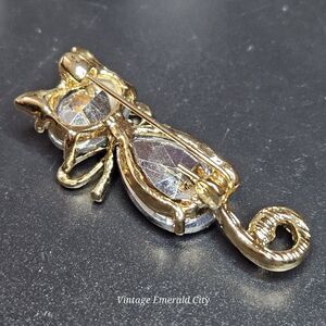 This gorgeous goldtone cat brooch is a dazzling addition to any jewelry collection! Featuring an iridescent rhinestone tail and ears, plus a crystal-encrusted bow, this feline friend sparkles with charm and elegance. Perfect for cat lovers, brooch collectors, or anyone who loves a touch of whimsy in their accessories.