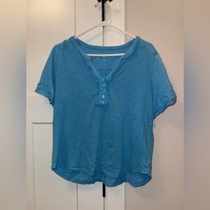 Soft and cozy short sleeve top. Features a buttoned neckline. Ideal for lounging.