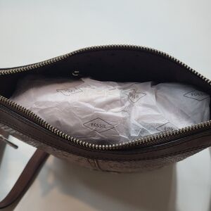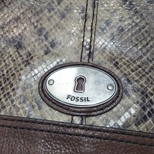 Fossil crossbody bag in brown leather with snakeskin pattern. Has an interior zippered pocket, compartment with credit card slots and adjustable strap. New without tags.