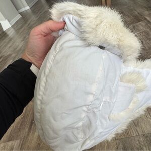 Keep your child warm with this stylish white fur-lined winter hat. Perfect for chilly days.