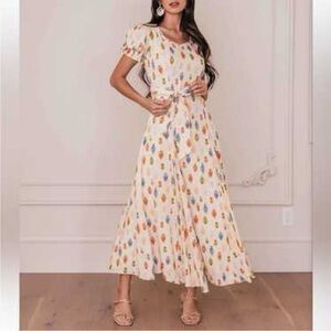 JessaKae (XL) Madrigal Dress Cream Bohemian Puff Sleeve Tie Waist Midi Dress
