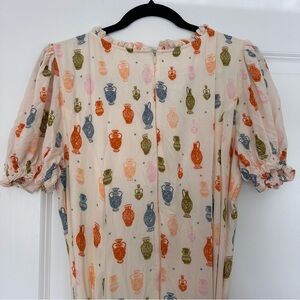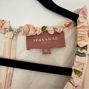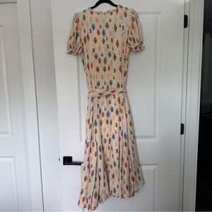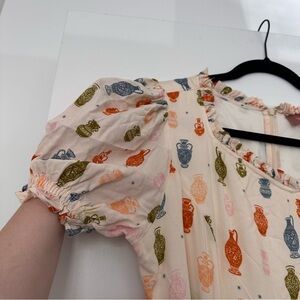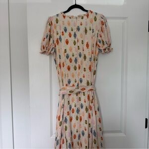 Jessa Kae “Madrigal” Dress in XL. This beautiful cream midi dress features a bold eclectic renaissance inspired print, complete with puff sleeve detailing, a tie waist, scoop neck with ruffle hem detailing, and a fit and flare bodice. Excellent condition- no rips stains holes etc.