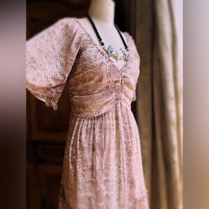 NWT dress only this listing. Vintage necklace is sold! M : Pit to pit is 20” shoulder to hem 52” . So much more beautiful in person! Looks amazing with the Moto jacket listed in my closet . Dress only this listing .color is like a dusty mauve &brown
