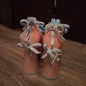 Dollskill Sugarthrillz Blue ribbon ruffle and pink satin shoes. Womens size 5. Super cute shoes-but the satin material scuffs/ dents easily as you can see in photos 4,5,6,7,8. Marked down due to these FLAWS, so keep that in mind!