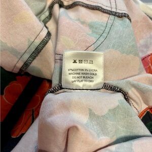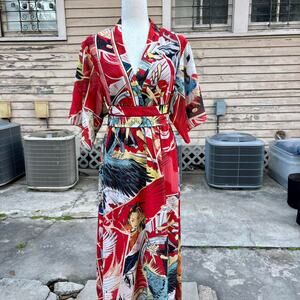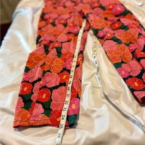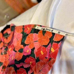 Red and orange poppy printed high waisted jumpsuit with zippered front, decorative buttons, and tapered leg. Fits like a dream. Can go anywhere depending on how it’s styled. Presently, the size in this suit is deadstock.