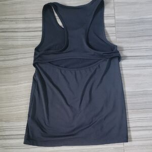 Black sleeveless top with bold Gymshark branding. Ideal for fitness.