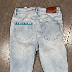 Stylish light blue skinny jeans. Features intricate blue embroidery on pockets and hem. Frayed edges for a trendy look. Are you ready to look gorgeous?