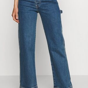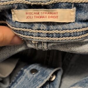 Timeless straight leg design. Durable denim fabric. Wide leg boot cut and high rise. Darts bring jeans in close up high and widen to the hips creating an hourglass shape. Raw but stitched bottom hem. Button up fly. Washed blue color with slight variations.