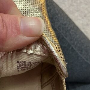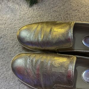 Shimmering gold loafers. Slip-on style. Comfortable and stylish.