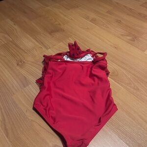 Vibrant red swimsuit with playful ruffles. Features star patterns for a fun look. Runs small more like 18 months