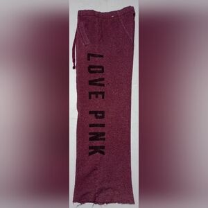 Chic burgundy jacket & pants with 'Love Pink' on sleeves as well on one of the pant legs.