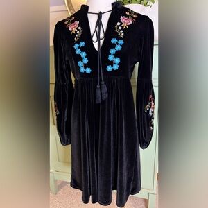 ASA Bohemian black velvet dress with intricate floral embroidery on the bodice and sleeves. Featuring a tassel tie closure at the neck leaving a v-neckline. Gathered long sleeves with elastic at the wrist. Babydoll flowy mini skirt.