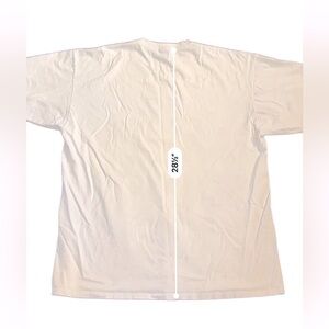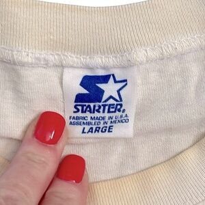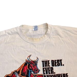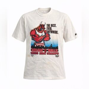 This is a pre-owned Starter brand, size Large, Chicago Bulls 1996 NBA Champs T-shirt. The shirt is white and features a graphic of a muscular bull. The shirt shows signs of wear, including multiple stains on the front and some discoloration around the collar. Made in the USA. Please see pictures for condition and measurements. It’s in fair condition but it’s still super cool and a great collectible