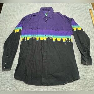 This Vintage Roper Shirt for men in size L features a classic Western design with a Pearl Snap closure and a collared neckline. Made of cotton canvas fabric in black color, this button-up shirt has a geometric Aztec pattern that adds a touch of retro cowboy style. Perfect for casual, workwear, or travel occasions, this regular fit shirt is machine washable and suitable for all seasons. With a nod to the American outdoor theme, this shirt is a timeless piece that embodies the essence of the classic Western look.