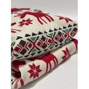 Capture the magic of the holiday season with this charming pajama set. Soft and snug, the set features a delightful reindeer and snowflake print, set against a cream backdrop. The red accents around the neckline and cuffs add a festive touch. Perfect for cozy nights by the fireplace, Christmas morning celebrations, or holiday-themed family photos. Please reference photos for any flaws features (small spots near leg cuff)