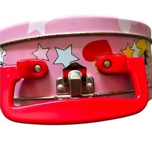 Betty Boop-themed tin, shaped like Betty’s face with her iconic wide eyes, red lips, and black hair on a pink background decorated with hearts and stars. Unique design.