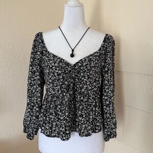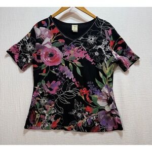 Desigual Black Ribbed Mock Neck Long Sleeve Floral Women's Top Size L Artsy