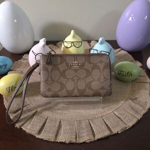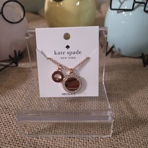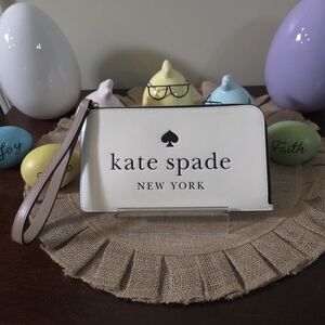 Stylish wallet with white polka dots. Features iconic Kate Spade logo.