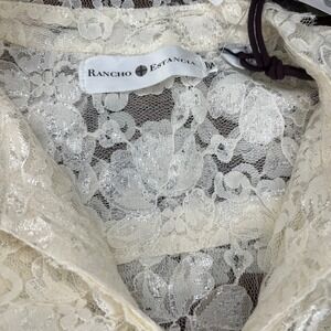 The Lace Ruffle Floral Button-down Rancho Estancia shirt is a special occasion piece with a Victorian look. Made of lace, this ivory shirt in size M exudes a classic and elegant style perfect for a variety of events. The ruffle detailing and floral design add a touch of femininity to this original vintage piece, making it a versatile addition to any woman's wardrobe.