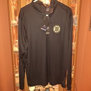 Men's Boston Bruins Antigua Quarter-Zip Pullover in black. It is available for purchase from various online retailers, with prices typically ranging from around $52 to $95.
