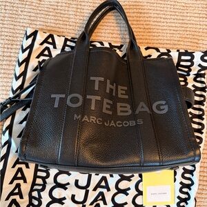 Sleek black leather tote by Marc Jacobs. Features sturdy handles and a detachable strap. Ideal for everyday use.
