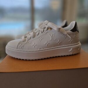 Size 7 LV Elegant white sneakers with iconic monogram design. Features textured detailing and classic style. Worn may 2x. Perfect Condition. Smoke Free Home. I love these so much! I just honestly have way too many shoes. 🤦♀️🤷♀️ Box, dust bag included
