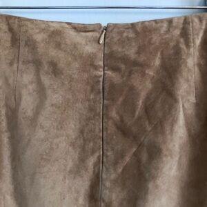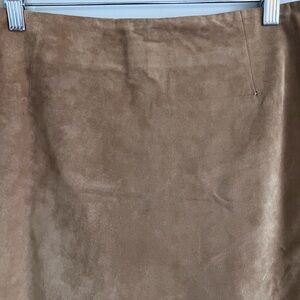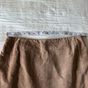Sleek and stylish, and also well constructed, this genuine suede leather skirt has all the vintage and feminine vibes. It is fully lined and has a hidden zipper in the back and also has a beautiful scalloped hem line that is embroidered with a floral pattern. Great for wearing to the office with a blouse, but also wearing it for a fun dressier occasion with a fitted cream colored turtleneck sweater and knee-high boots.