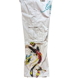 Ed Hardy joggers in light gray. Features vibrant graphic design. Comfortable and stylish for everyday wear. Brand new with tag.