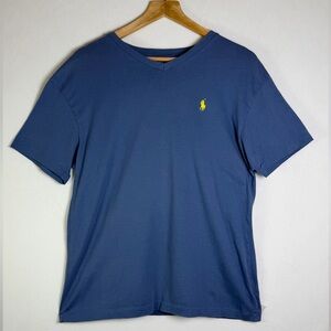 Timeless Polo Ralph Lauren V-neck t-shirt in a rich blue tone with the iconic embroidered yellow pony logo at chest. This is a classic, elevated essential that fits perfectly into quiet luxury, old-money, preppy, and minimalist capsule wardrobe aesthetics. Soft cotton feel with a clean silhouette—easy to dress up or down for everyday wear.
