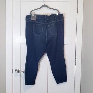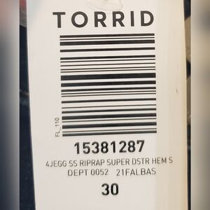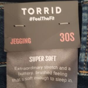Torrid high rise with stretch jeggings jeans are darkwash distressed & have 3 button smoothing waistband. These are brand new with tags & have no flaws & are machine wash please see pic for fabric tag. Size 30 SHORT approx FLAT LAY measurement (not stretching) :