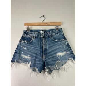 NEW Moussy Vintage Distressed Frayed Hem Whisker Faded Walworth Shorts Blue