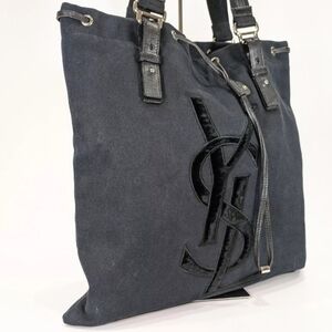 Elevate your style with this vintage early 2000s Yves Saint Laurent Rive Gauche Kahala canvas tote bag. Made with durable black canvas and accented with sleek silver hardware and black leather trim, this bag is both fashionable and functional. Complete with a luxurious "YSL" front logo in black velvet, this tote is the perfect addition to any outfit.