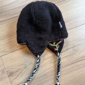 100% Wool outer. Handcrafted in Nepal. Earflap Embroidered Beanie - Black Floral