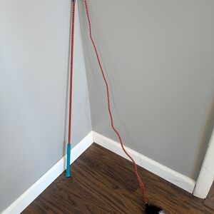 Fun cat toy wand with a red rope and black and white plush tail. Perfect for interactive play. wand is about 3ft with string about 4ft. very sturdy. the tail has a rattle inside it is not sharp sounding or loud making this a less annoying toy. I believe the brand is outward hound. my dogs hate it so it's in brand new condition