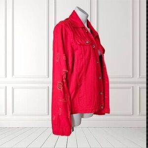 Stylish deep red denim jacket perfect for casual outings. Features a classic design with button closures and distressed details. Ideal for adding a bold touch to your wardrobe.