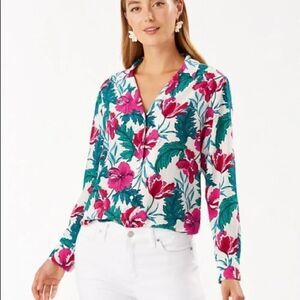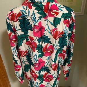 Brand new with tags. Paradise is never far away when you're in this silk button-up. With a design as vibrant as your personality, this shirt will give you those island vibes, no matter where you go.
