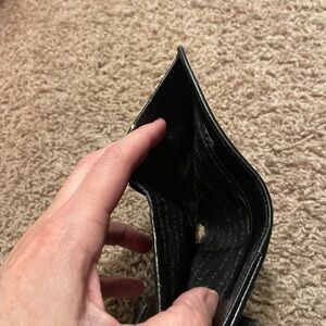Stylish plaid canvas wallet with black trim. Features a classic design. Gently used