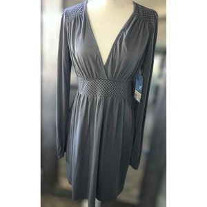 dress made ot tulle fabric. Round neck and long sleeves. Draped detail at waistband.