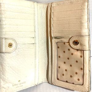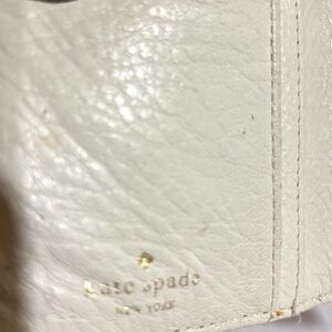 Elegant and stylish, this Kate Spade black wallet is perfect for any occasion. Crafted with attention to detail, it offers both functionality and fashion. Main compartment 4 cash slots 12 cards slots 1 lD slots logo at front lining have marks stains zip pocket at back exterior have scratches hight 7” wide 3.5”