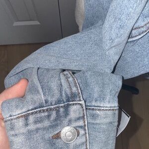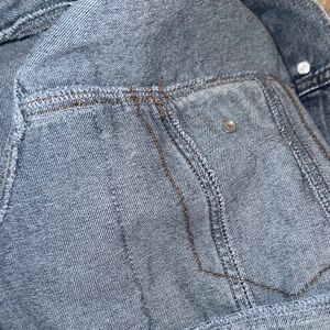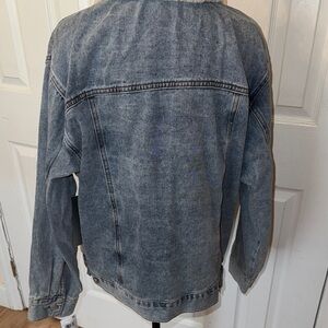Classic denim jacket with cozy sherpa lining. Button-front closure. Ideal for layering.