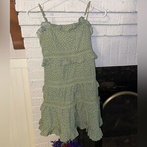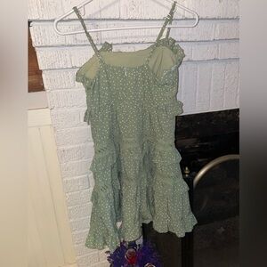 This dress is super cute. It’s green with polkadots and ruffles nicely made. It is also lined. It zips in the back. High quality dress.