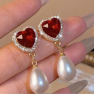 These stunning earrings feature vibrant red heart-shaped stones surrounded by sparkling accents, paired with elegant pearl drops. Perfect for adding a touch of glamour to any outfit.