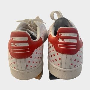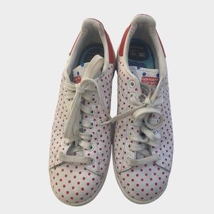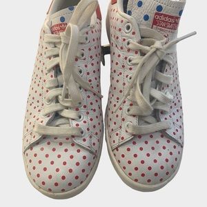 Gently used Pharrell Williams Stan Smith Polka Dot Adidas Genuine Leather Red polka dots with blue dots on tongue. Size 8.5